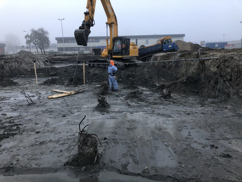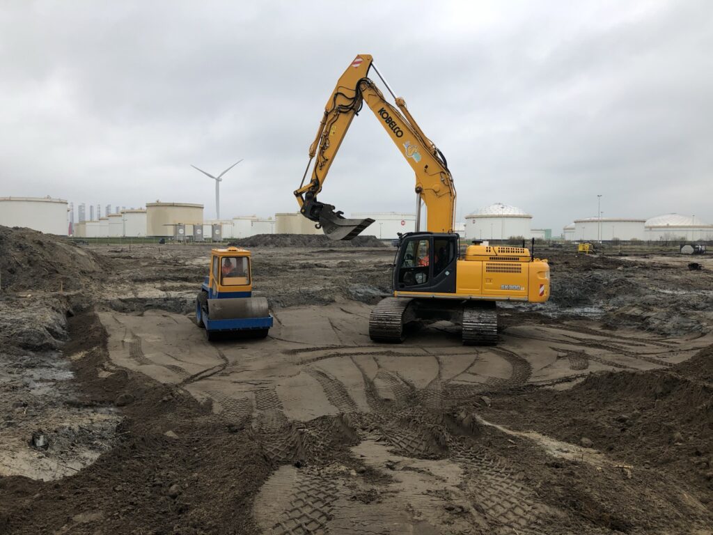 - na ontgraven weer aanvullen/verdichten gehele terrein met zand.